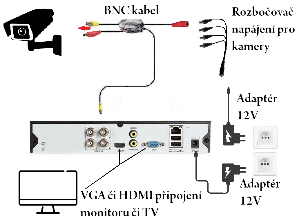 Velmi jednoduchá instalace kamerového systému, stačí pouze zapojit samotné kamery k rekordéru a ten připojit k monitoru/TV (HDMI/VGA), samozřejmostí je zapojení do elektrické sítě. Složitost připojení lze srovnat s připojením DVD přehrávače, tudíž instalaci zvládne opravdu každý. Připojením kamerového setu k internetu získáte funkci vzdáleného sledování na Vašem telefonu/mobilu.