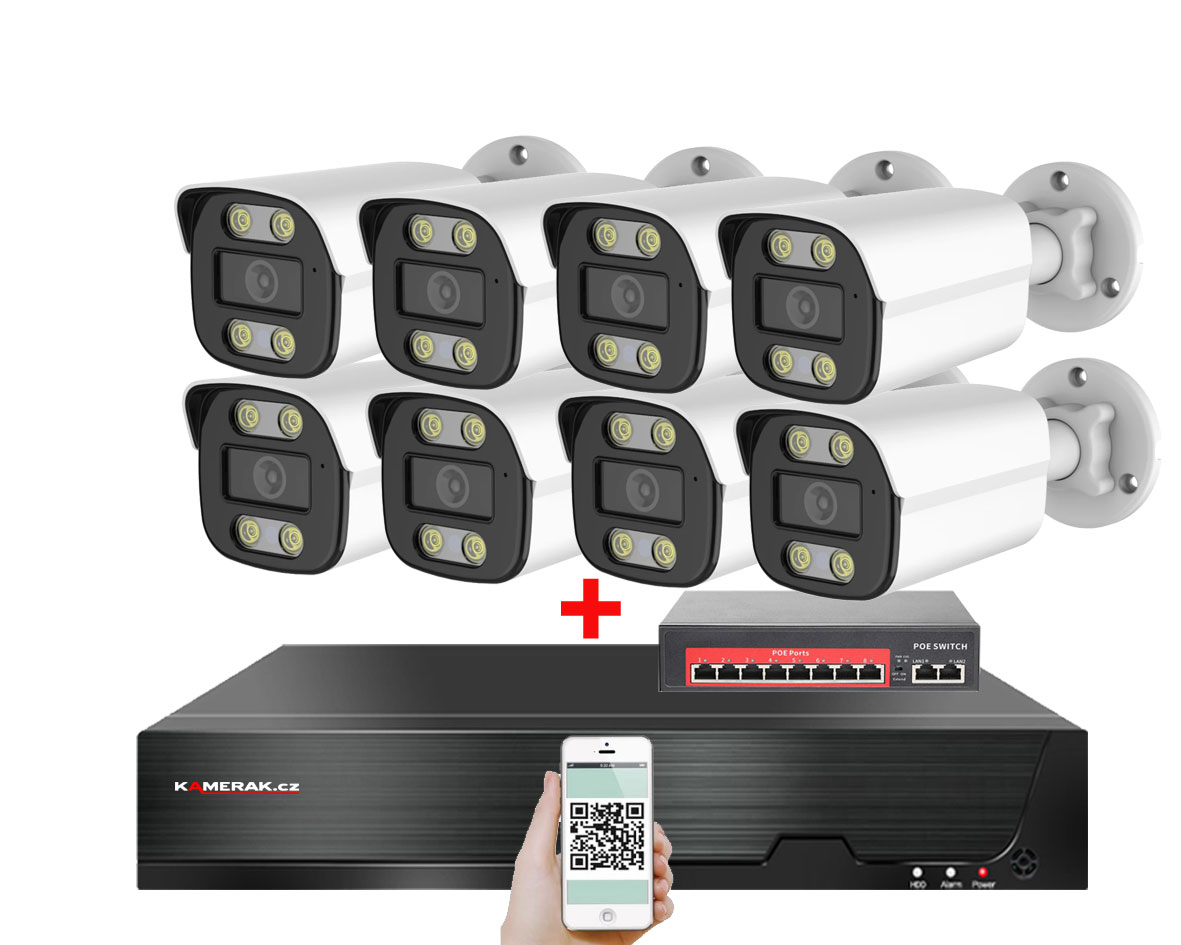 IP kamerový set s externím PoE pro jednoduché sestavení svépomocí. NVR v sobě nemá instalováno napájení kamer, které je řešeno pomocí switch. Lze tedy umístit switch (napájení IP kamer) na jiné místo než rekordér, který se následně připojuje k obrazovce/internetu.