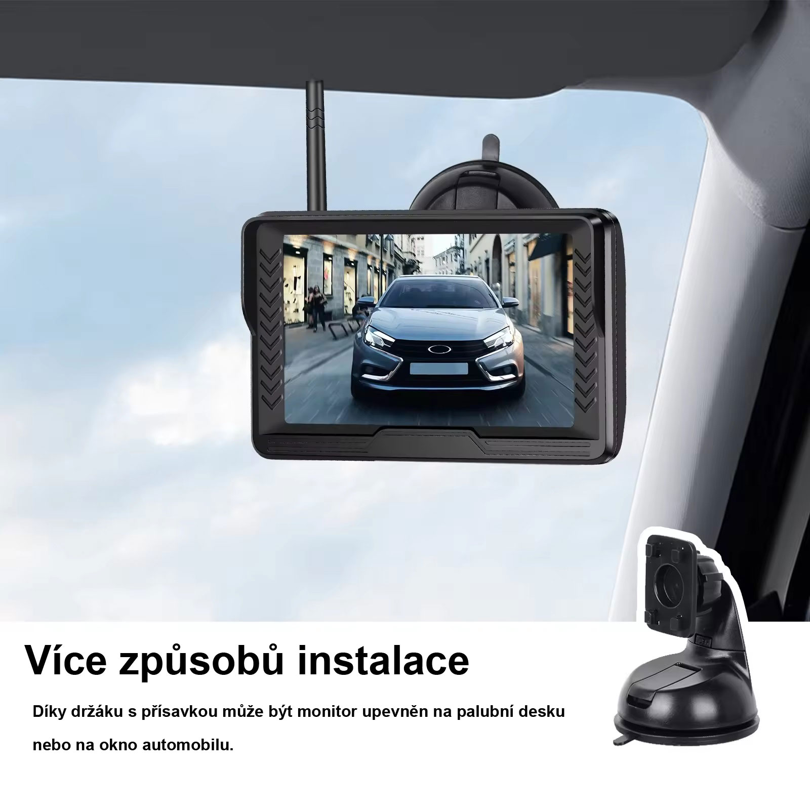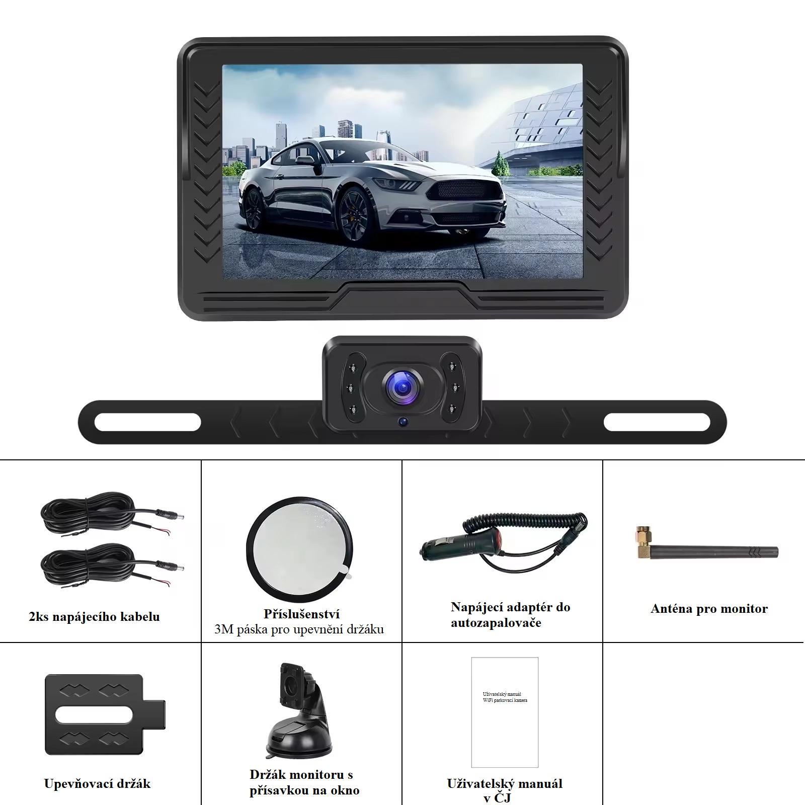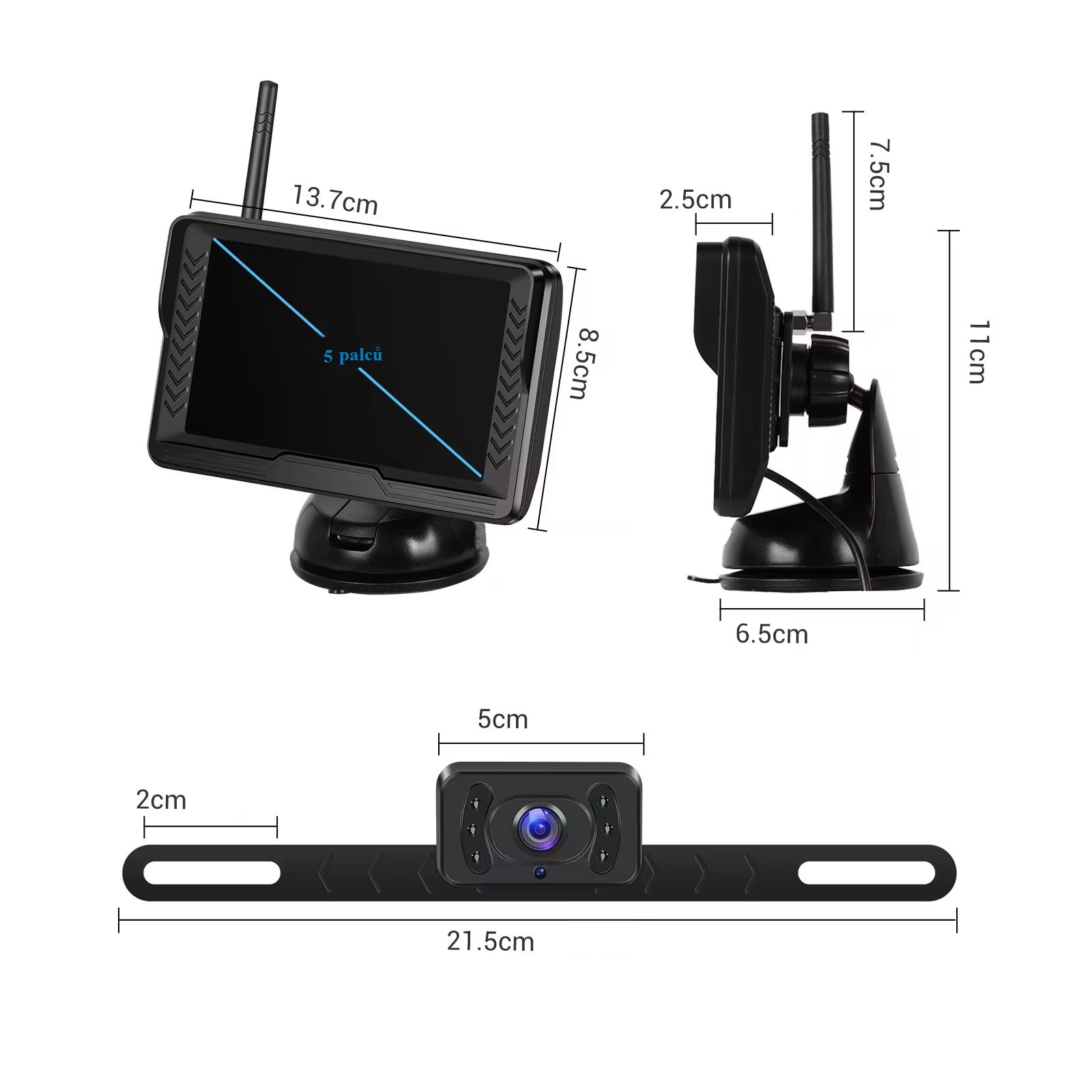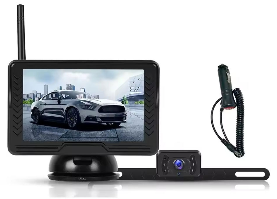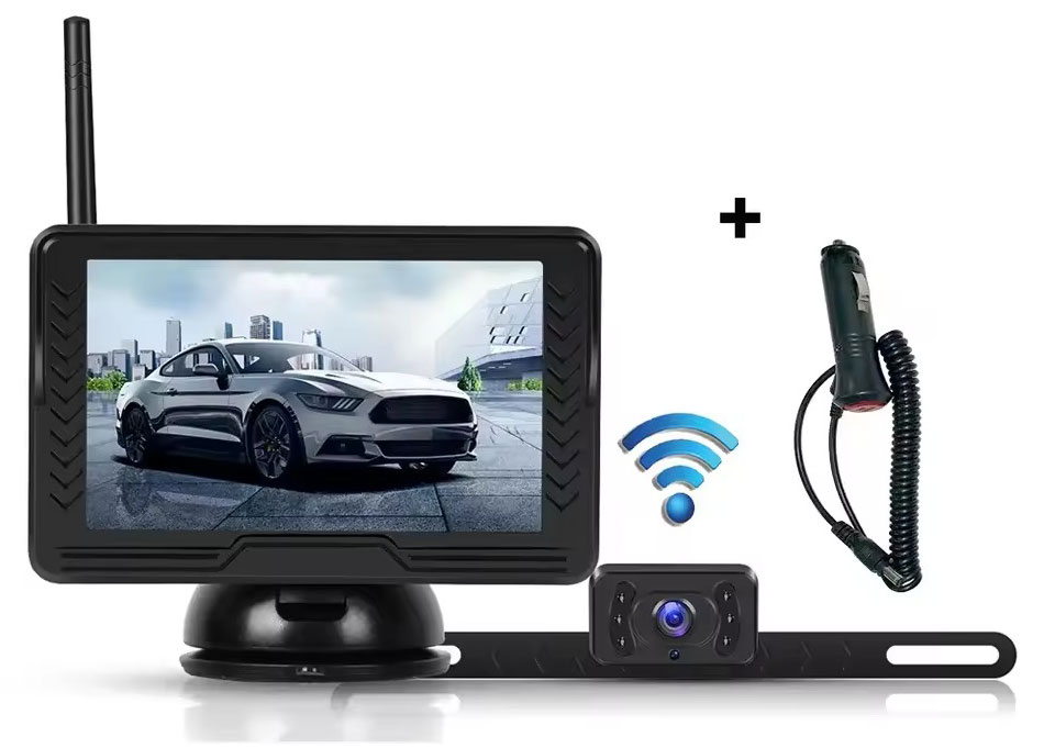 WiFi parkovací set monitoru o velikosti 5 palců a kamera s držákem na SPZ Vám zajistí přehled o dění kolem Vašeho vozidla. Díky bezdrátové technologii není nutné propojovat monitor s kamerou kabelem, čímž se lze vyhnout protahování kabelu skrz celé auto nebo lze využít pro vozíky a další, které je potřeba odpojovat.
