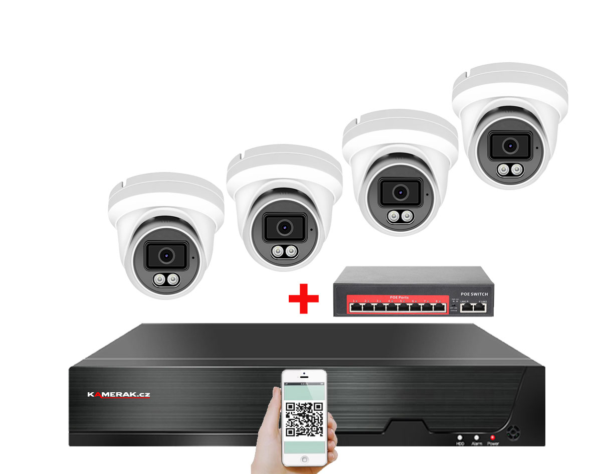 IP kamerový set s externím PoE pro jednoduché sestavení svépomocí. NVR v sobě nemá instalováno napájení kamer, které je řešeno pomocí switch. Lze tedy umístit switch (napájení IP kamer) na jiné místo než rekordér, který se následně připojuje k obrazovce/internetu.