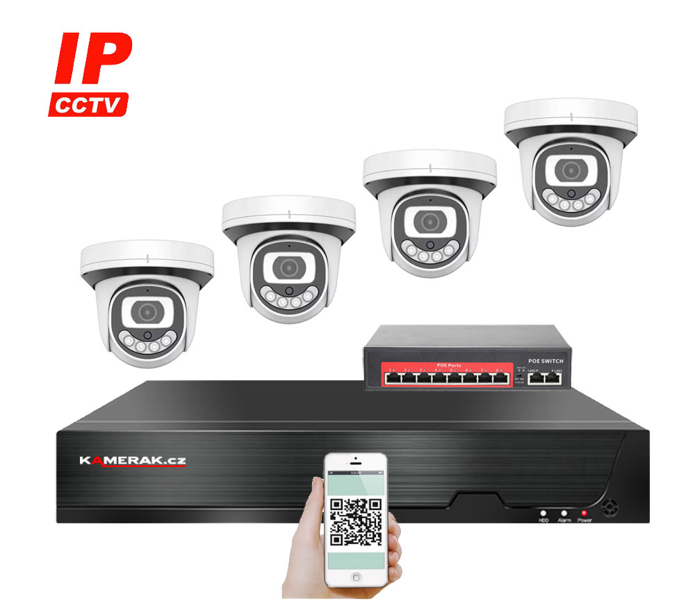 IP kamerový set s externím PoE pro jednoduché sestavení svépomocí. NVR v sobě nemá instalováno napájení kamer, které je řešeno pomocí switch. Lze tedy umístit switch (napájení IP kamer) na jiné místo než rekordér, který se následně připojuje k obrazovce/internetu.