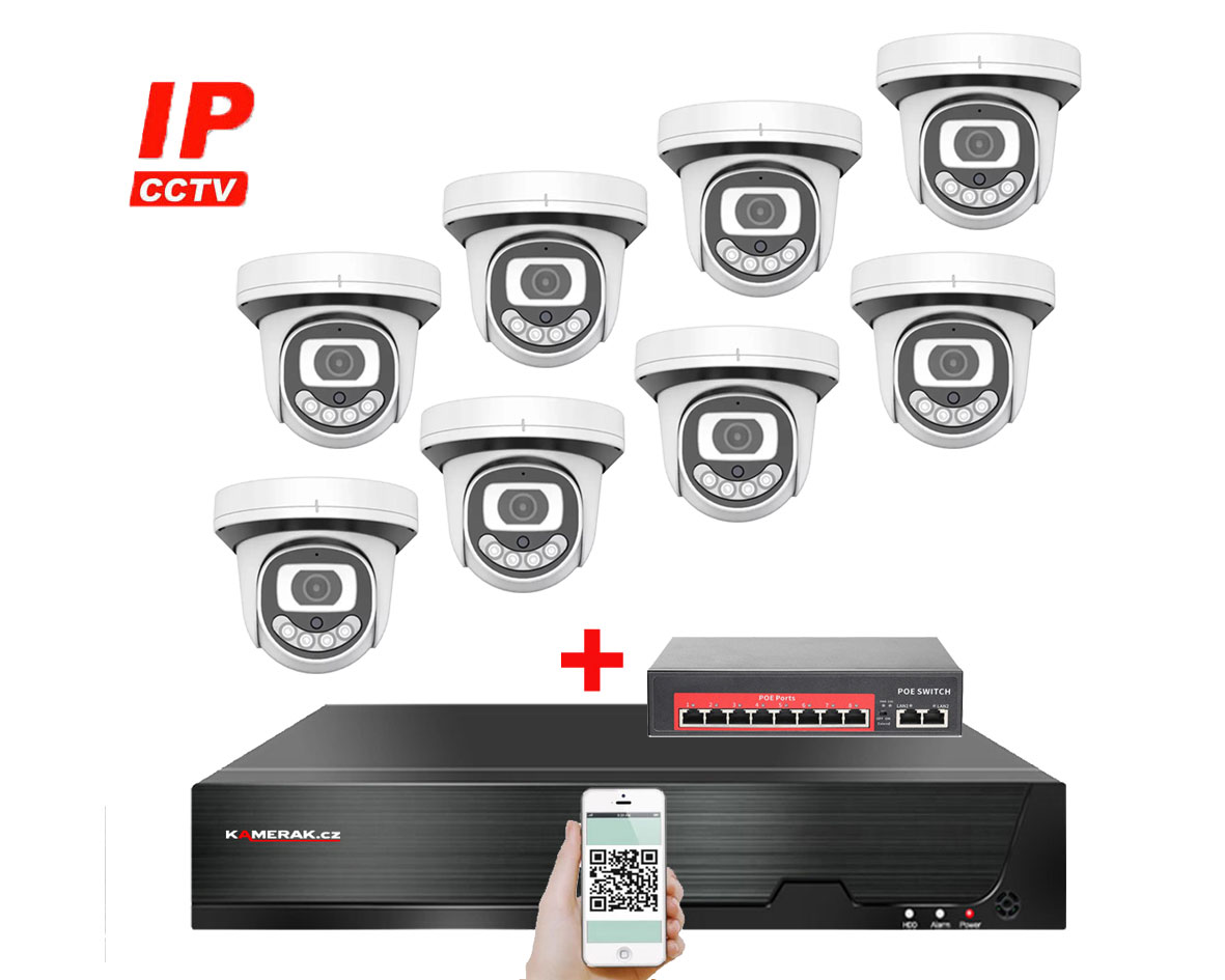 IP kamerový set s externím PoE pro jednoduché sestavení svépomocí. NVR v sobě nemá instalováno napájení kamer, které je řešeno pomocí switch. Lze tedy umístit switch (napájení IP kamer) na jiné místo než rekordér, který se následně připojuje k obrazovce/internetu.