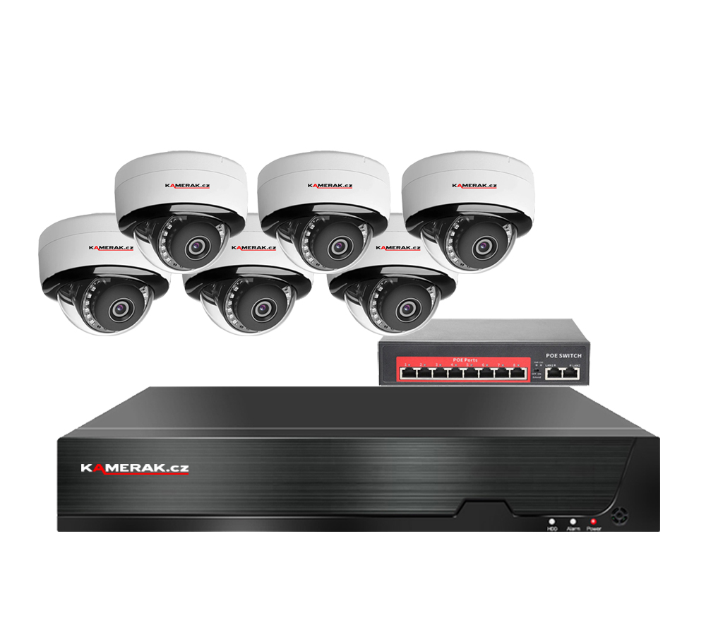 IP kamerový set s externím PoE pro jednoduché sestavení svépomocí. NVR v sobě nemá instalováno napájení kamer, které je řešeno pomocí switch. Lze tedy umístit switch (napájení IP kamer) na jiné místo než rekordér, který se následně připojuje k obrazovce/internetu.