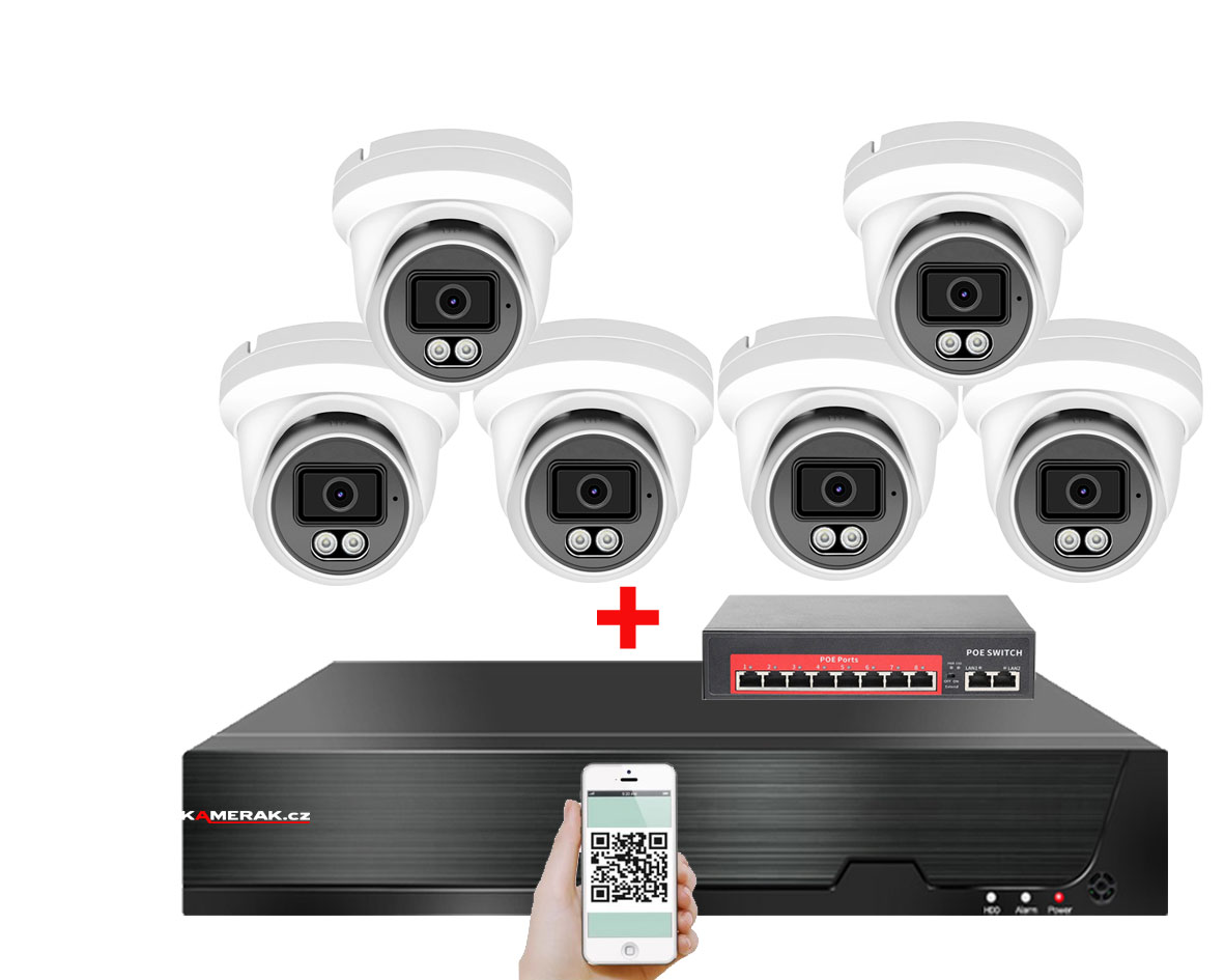 IP kamerový set s externím PoE pro jednoduché sestavení svépomocí. NVR v sobě nemá instalováno napájení kamer, které je řešeno pomocí switch. Lze tedy umístit switch (napájení IP kamer) na jiné místo než rekordér, který se následně připojuje k obrazovce/internetu.