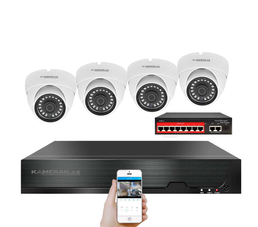 IP kamerový set s externím PoE pro jednoduché sestavení svépomocí. NVR v sobě nemá instalováno napájení kamer, které je řešeno pomocí switch. Lze tedy umístit switch (napájení IP kamer) na jiné místo než rekordér, který se následně připojuje k obrazovce/internetu.