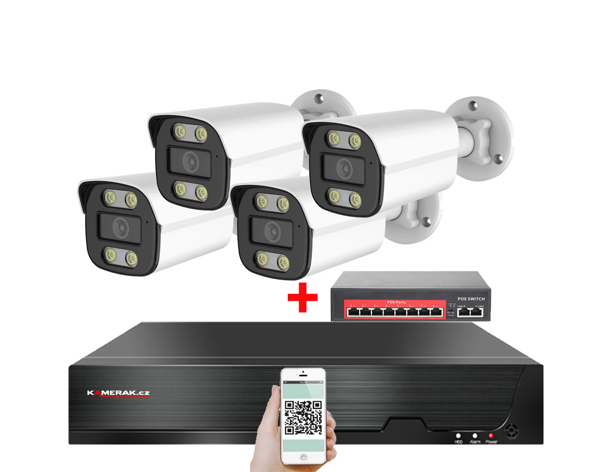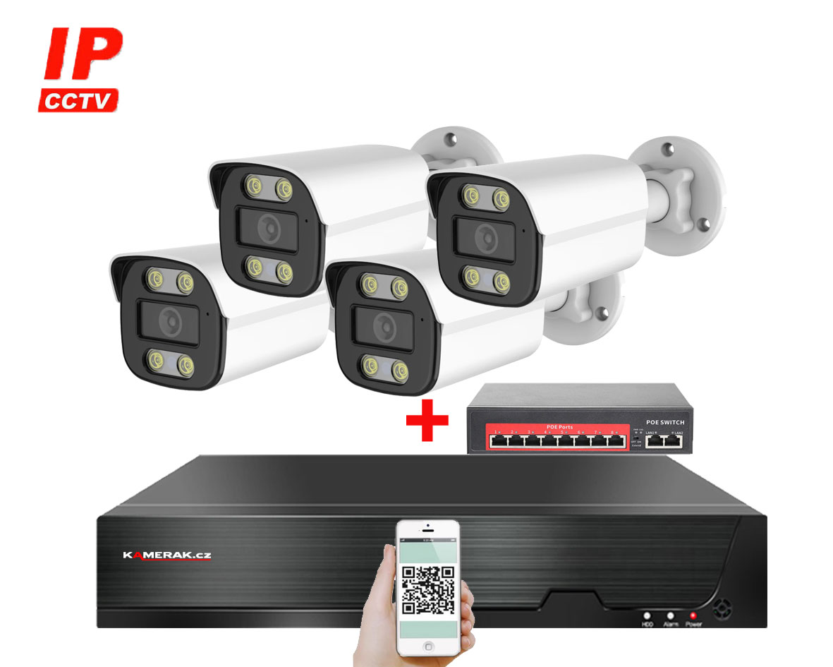 IP kamerový set s externím PoE pro jednoduché sestavení svépomocí. NVR v sobě nemá instalováno napájení kamer, které je řešeno pomocí switch. Lze tedy umístit switch (napájení IP kamer) na jiné místo než rekordér, který se následně připojuje k obrazovce/internetu.
