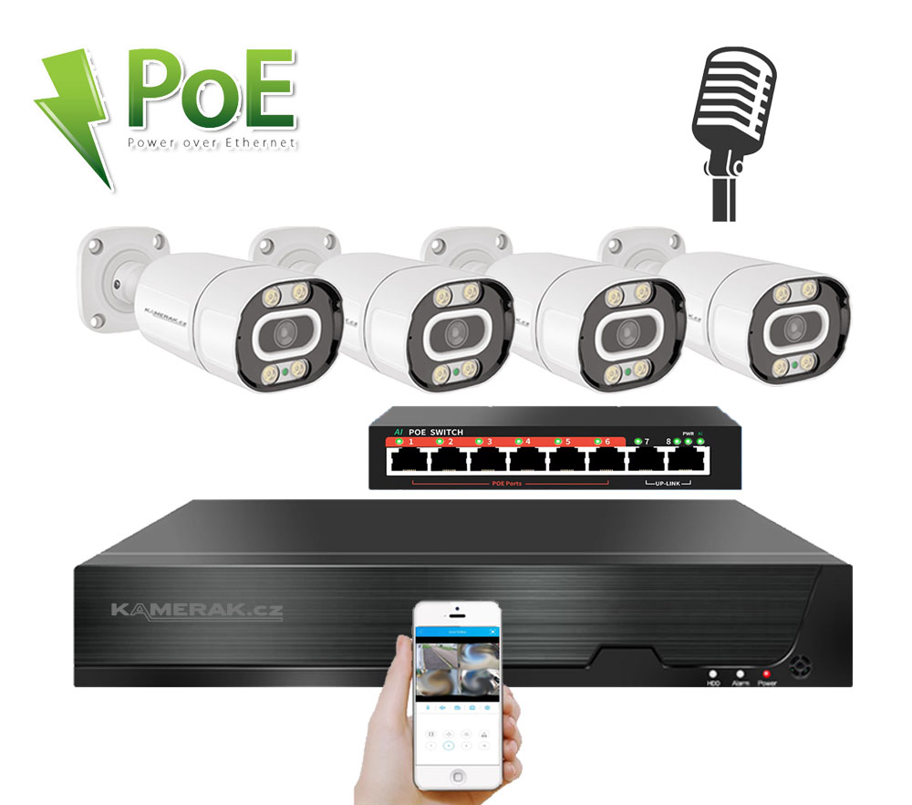 IP kamerový set s externím PoE pro jednoduché sestavení svépomocí. NVR v sobě nemá instalováno napájení kamer, které je řešeno pomocí switch. Lze tedy umístit switch (napájení IP kamer) na jiné místo než rekordér, který se následně připojuje k obrazovce/internetu.