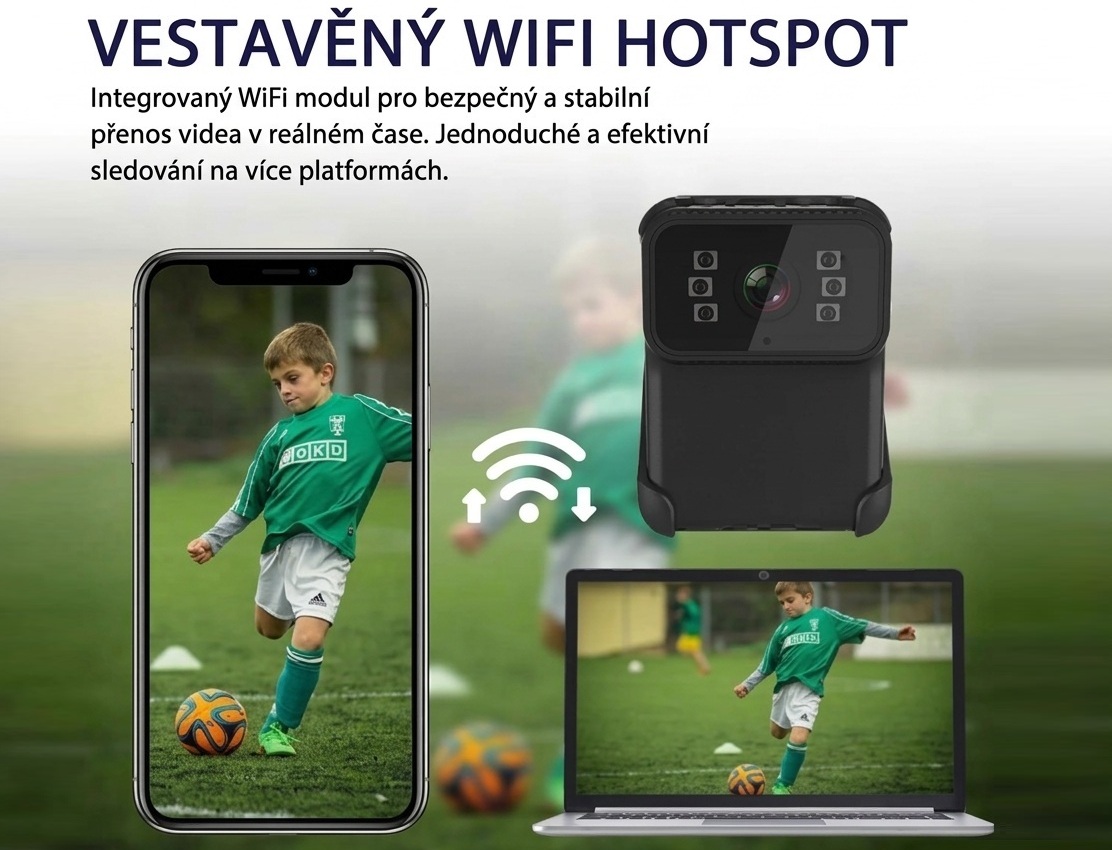 Kamera je vybavena vestavěným Wi-Fi hotspotem, který vám umožní její snadné bezdrátové propojení s vaším chytrým telefonem. Pomocí mobilní aplikace "Sports Camera" (dostupná pro iOS i Android) můžete sledovat živý náhled kamery přímo na displeji telefonu.