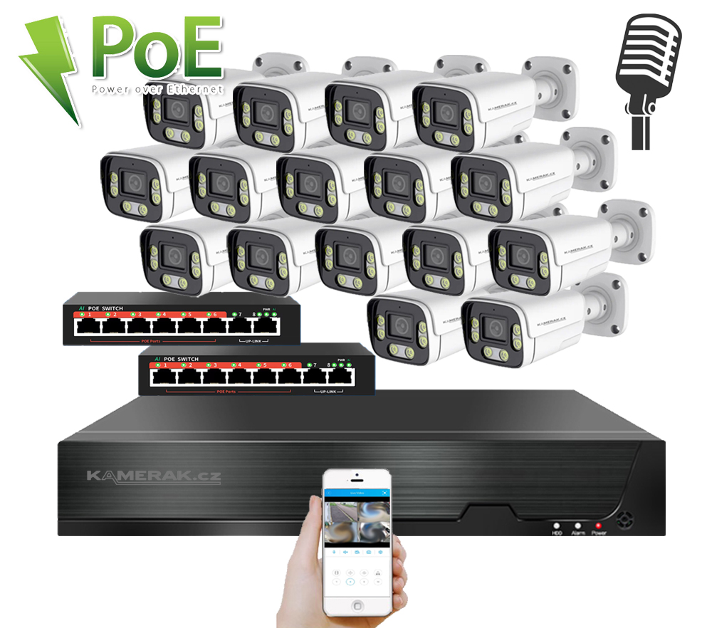 IP kamerový set s externím PoE pro jednoduché sestavení svépomocí. NVR v sobě nemá instalováno napájení kamer, které je řešeno pomocí switch. Lze tedy umístit switch (napájení IP kamer) na jiné místo ne rekordér, který se následně připojuje k obrazovce/internetu.