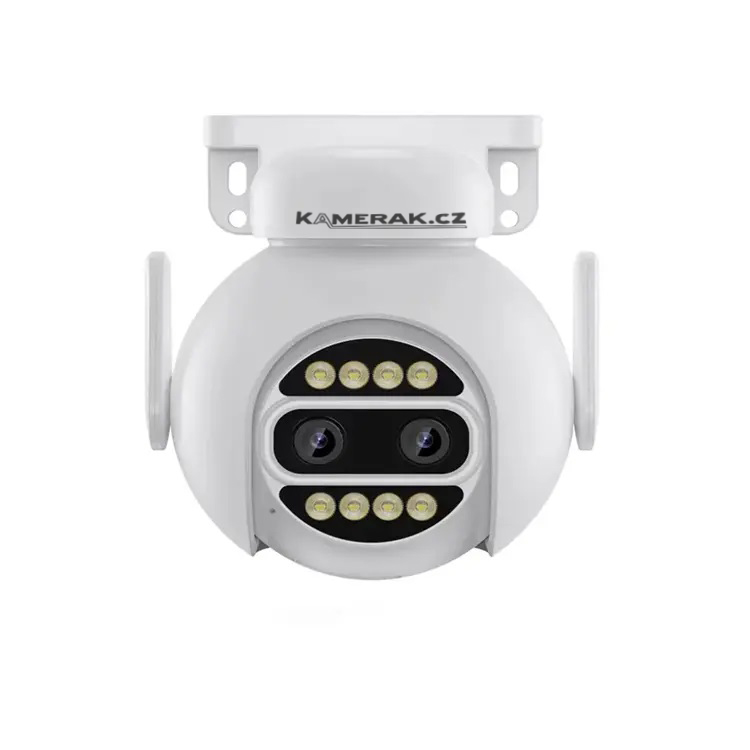 Výkonná bezdrátová Wi-Fi IP kamera typu DOME s otočným motorizovaným objektivem ve venkovním provedení s krytím IP66, silným nočním infračerveným viděním a zároveň silným LED světlem, je vhodná pro firemní i domácí použití, pokud požadujete velice detailní a ostrý obraz s možností otáčení objektivu. Nabízí vysoké rozlišení díky dvěma čočkám 4Mpx, kdy jedna čočka s ohniskem 2,8mm "sleduje dění blíže" ke kameře a 12mm "vdálenější", kamera je schopna využívat obou čoček pro přiblížení obrazu. Záznam je ukládám v přiblížení, které je nastaveno k živému náhledu kamery. Moderní kompresi videa kodekem H.264/H.265, konektivitu do bezdrátové sítě WLAN pomocí Wi-Fi a do sítě LAN pomocí konektoru RJ-45, nízkou spotřebu a vysokou spolehlivost i za nepříznivých podmínek. Tato kamera má integrovaný slot na standardní paměťové karty MicroSD (max 128GB) a podporuje autonomní nahrávání ve smyčce, bez nutnosti dalších záznamových zařízení. Kameru lze vzdáleně ovládat a otáčet objektivem. Podporuje protokol ONVIF pro snadné připojení k záznamovému zařízení (NVR). Spolupracuje s aplikací pro chytré telefony a tablety s Android OS a iOS pro vzdálené sledování, náhled kamery lze taktéž sledovat v PC.