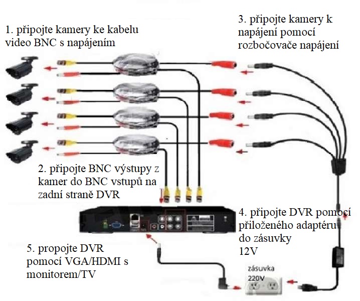 Velmi jednoduchá instalace kamerového systému, stačí pouze zapojit samotné kamery k rekordéru a ten připojit k monitoru/TV (HDMI/VGA), samozřejmostí je zapojení do elektrické sítě. Složitost připojení lze srovnat s připojením DVD přehrávače, tudíž instalaci zvládne opravdu každý. Připojením kamerového setu k internetu získáte funkci vzdáleného sledování na Vašem telefonu/mobilu.