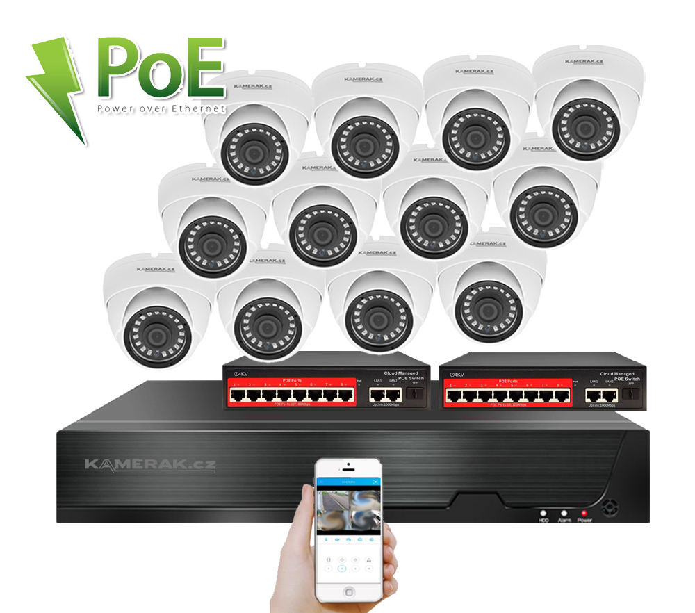 IP kamerový set s externím PoE pro jednoduché sestavení svépomocí. NVR v sobě nemá instalováno napájení kamer, které je řešeno pomocí switch. Lze tedy umístit switch (napájení IP kamer) na jiné místo než rekordér, který se následně připojuje k obrazovce/internetu.