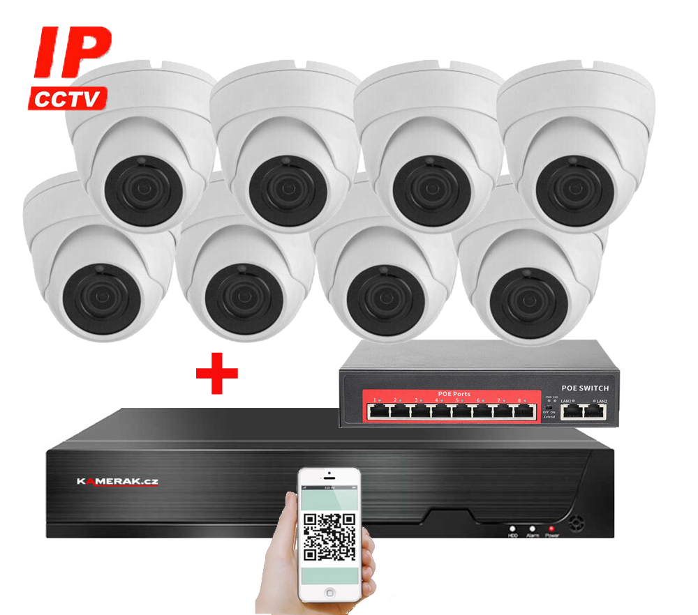 IP kamerový set s externím PoE pro jednoduché sestavení svépomocí. NVR v sobě nemá instalováno napájení kamer, které je řešeno pomocí switch. Lze tedy umístit switch (napájení IP kamer) na jiné místo než rekordér, který se následně připojuje k obrazovce/internetu.