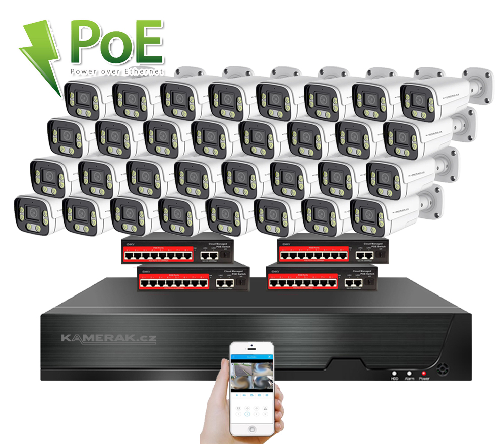 IP kamerový set s externím PoE pro jednoduché sestavení svépomocí. NVR v sobě nemá instalováno napájení kamer, které je řešeno pomocí switch. Lze tedy umístit switch (napájení IP kamer) na jiné místo než rekordér, který se následně připojuje k obrazovce/internetu.