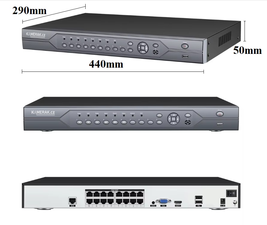 Záznam probíhá v plném rozlišení až 8 MPx (2592 x 1944 pixelů) obrazových bodů v rychlosti až 30 snímků za sekundu. Rekordér lze osadit 2ks SATA II/II pevným diskem až do kapacity 8TB. Připojení zařízení k televizi či monitoru se realizuje pomocí HDMI, VGA či analogového rozhraní. Nastavení lze provádět z českého OSD Menu na obrazovce připojené televize pomocí myši, kterou naleznete v příslušenství.