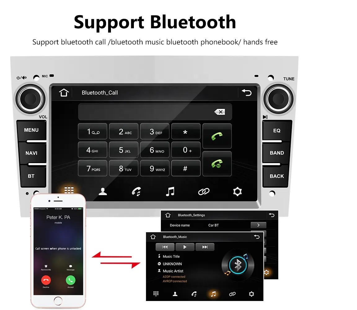 10. Vestavěný BT s A2DP/Hands Free/Telefonní seznam: BT hands-free volání, BT hudební přehrávač, Automatické načítání telefonních seznamů.