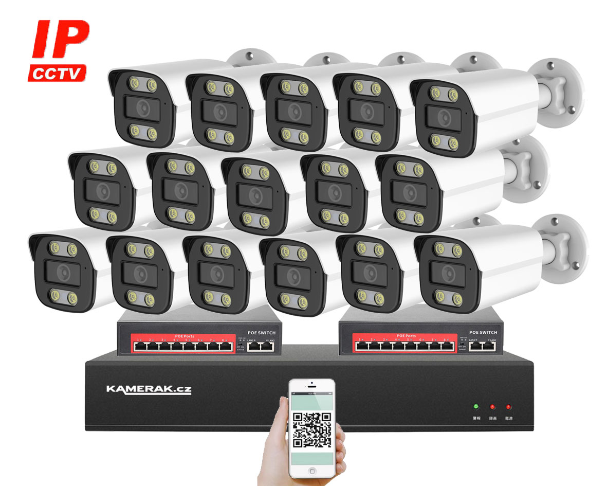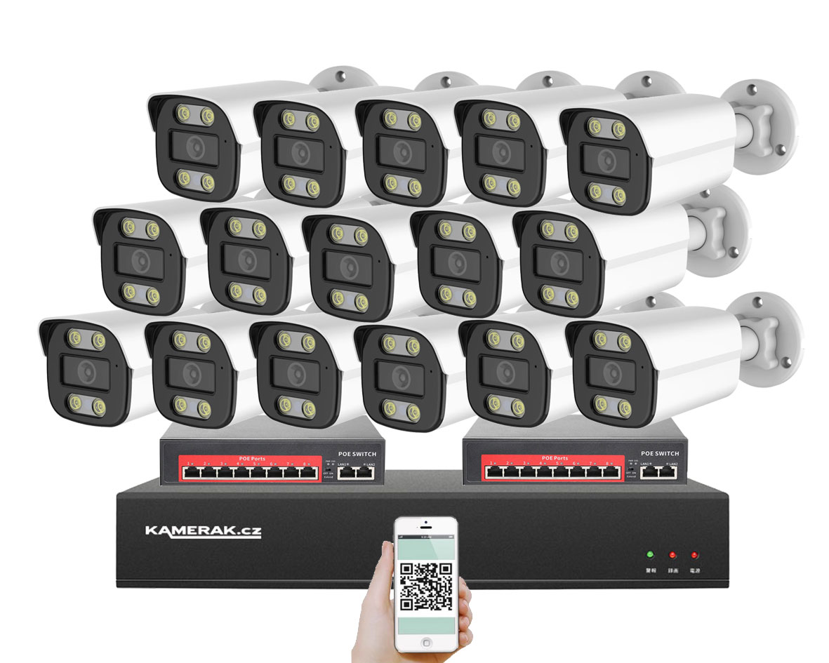 IP kamerový set s externím PoE pro jednoduché sestavení svépomocí. NVR v sobě nemá instalováno napájení kamer, které je řešeno pomocí switch. Lze tedy umístit switch (napájení IP kamer) na jiné místo než rekordér, který se následně připojuje k obrazovce/internetu.