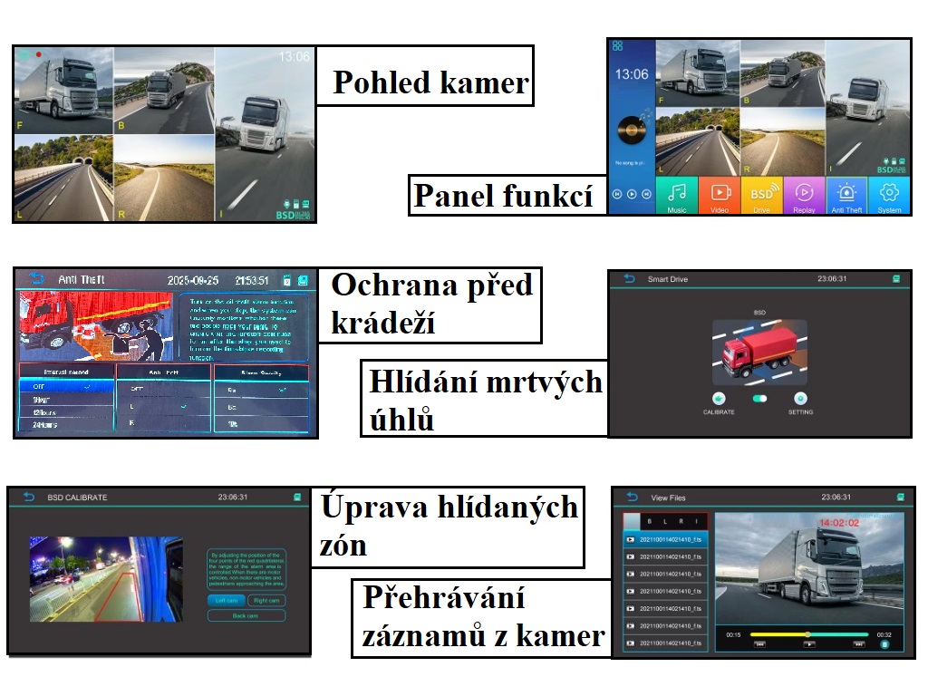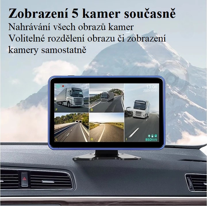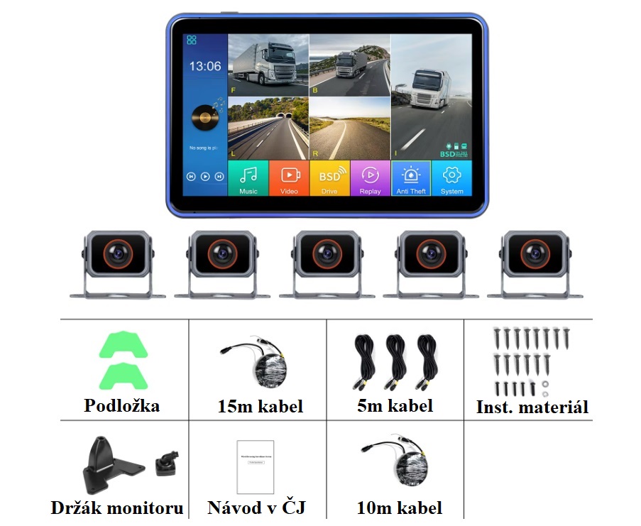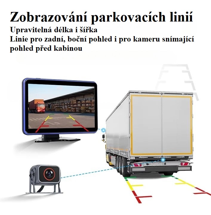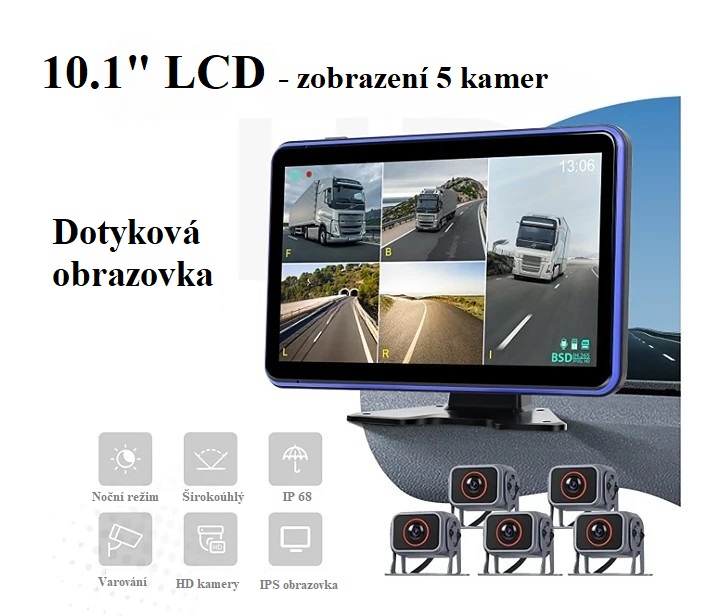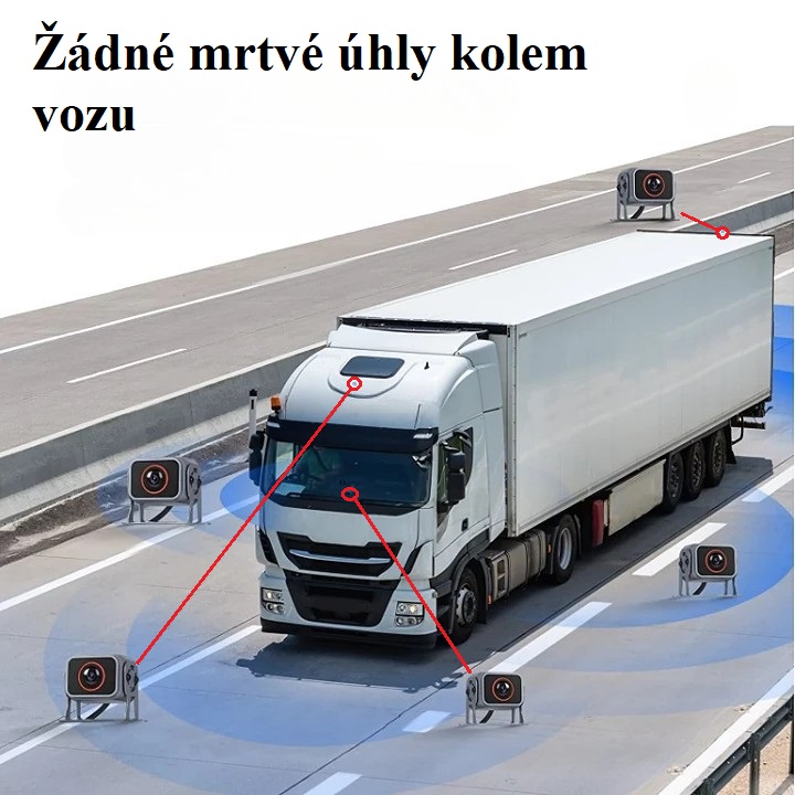 Moderní parkovací / monitorovací systém pro nákladní vozidla, autobusy či obytné vozy nabízí pokrytí všech mrtvých úhlů výhledu řidče pomocí pěti Full HD kamer včetně BSD (varování před chodci). Obraz kamer lze při vložení micro SD karty nahrávat, tyto záznamy je následně možné přehrávat přímo v monitoru či přenést do PC.