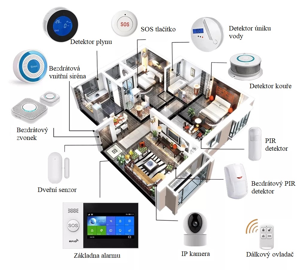 Zařízení můžete ovládat mnoha způsoby. Samozřejmostí je ovládání pomocí samotné základny alarm systému, další možností je pomocí Vašeho spárovaného telefonu (mobilní app), využití GSM sítě (SIM) pro spuštění/ vypnutí/ informace o narušení či základní ovládání (zapnutí, vypnutí či SOS) přiloženým malým dálkovým ovladačem nebo RFID klíčenkou.