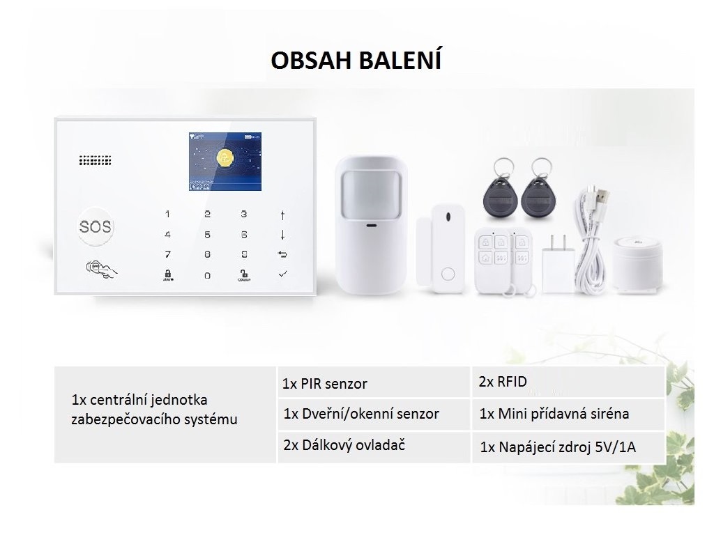 Základna je taktéž vybavena reproduktorem pro zvukový projev při alarmu. Externí siréna v tomto alarm systému je drátová, kterou připojíte přímo do základny alarmu. Další zařízení (PIR čidlo, dveřní/okenní čidlo) jsou již bezdrátové s vlastní baterií.