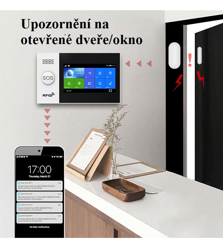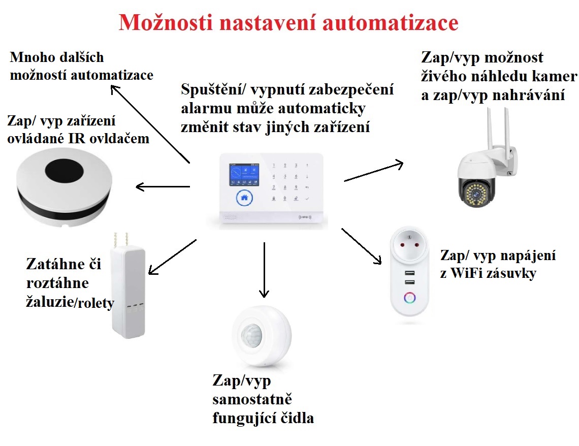 TUYA alarm systém Vám po připojení k Vaší wifi síti a spárování s Vaším telefonem pošle upozornění o spuštění zabezpečení, vypnutí zabezpečení tak i pokud některé z čidel zaznamená pohyb (v režimu spuštěného zabezpečení). Upozornění na Váš telefon může alarm systém poslat i pokud zařízení umístíte v oblasti bez WIFI sítě a to tím, že do zařízení vložíte SIM kartu a následně si nastavíte, že chcete aby Vám alarm systém zavolal nebo poslal SMS o změnách zabezpečení či narušení objektu, lze přidat až 5 telefonních čísel. V případě vložení SIM karty je možné pomocí základny taktéž volat.
