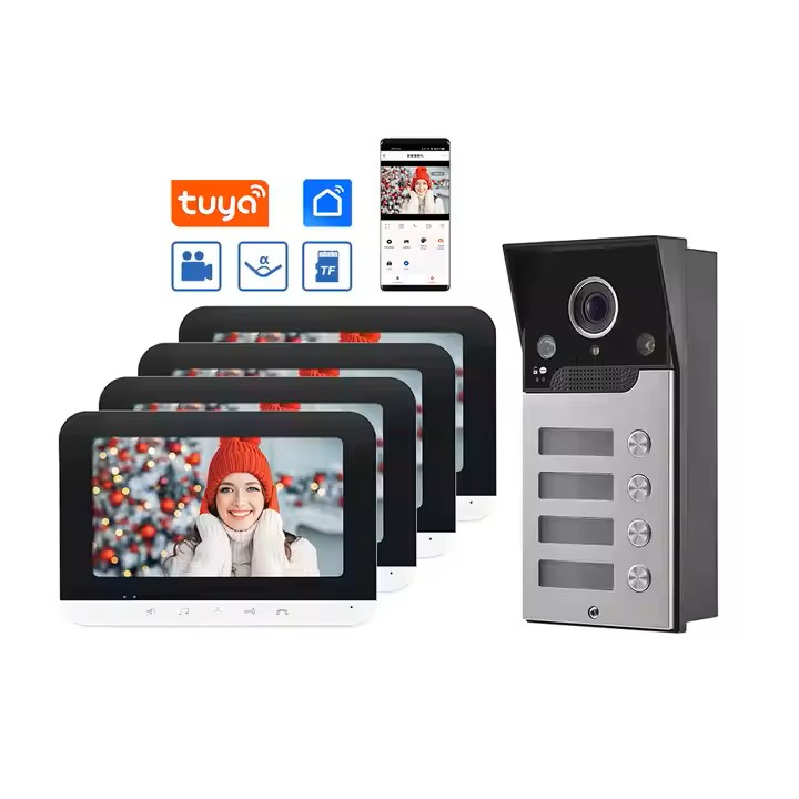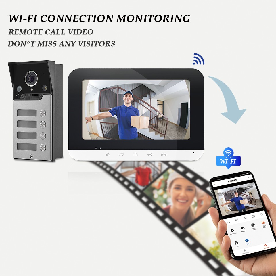 Sada čtyř Wifi video telefonu a vnější jednotky, která má dva odělené zvonky s integrovanou kamerou potěší zejména uživatele, kteří chtějí mít přehled i o tom co se dělo před jejich domem v jejich nepřítomnosti. Sada je určená do nemovistostí kde jsou dvě oddělené jednotky. Tento video telefon spustí automaticky video záznam kdykoliv někdo zazvoní. Video záznamy lze pořizovat i ručně v režimu náhledu.