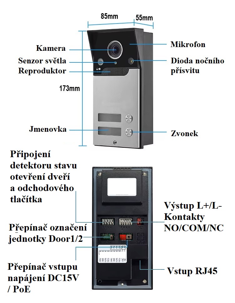 Sada 2ks Chytrého Wifi Video Telefonu a Vnější Jednotky s Integrovanou Kamerou se dvěma zvonky s možností připojení dalších PoE IP kamer. Vnější jednotka vybavena RFID čtečkou umožňující autorizaci a tím i otevření el. zámku přiložením RFID čipu.