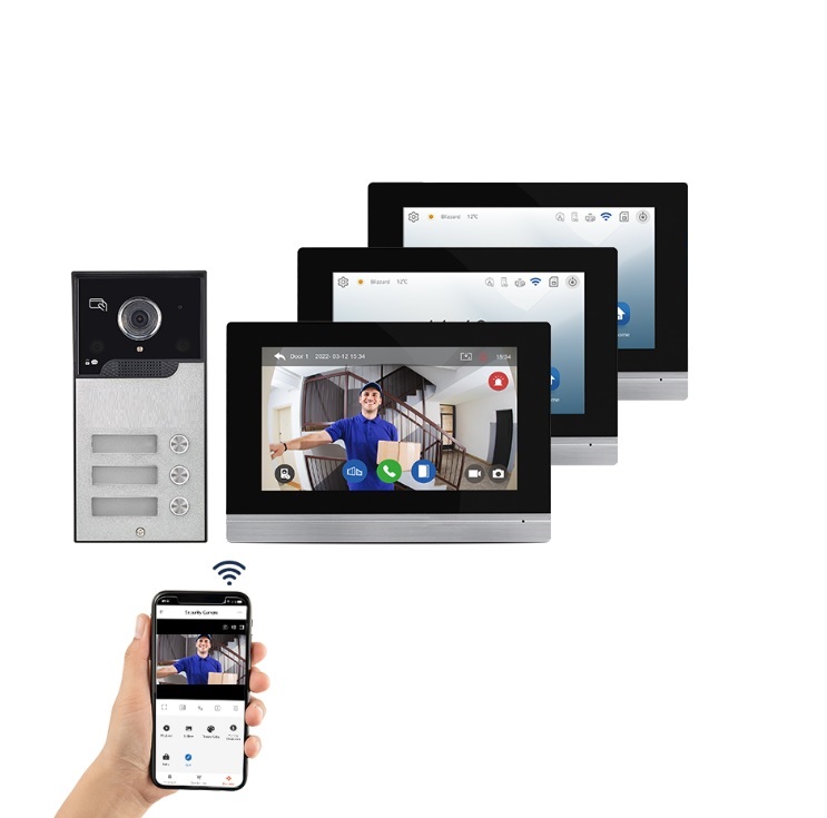 Sada 3ks Chytrého Wifi Video Telefonu a Vnější Jednotky s Integrovanou Kamerou se dvěma zvonky s možností připojení dalších PoE IP kamer. Vnější jednotka vybavena RFID čtečkou umožňující autorizaci a tím i otevření el. zámku přiložením RFID čipu.
