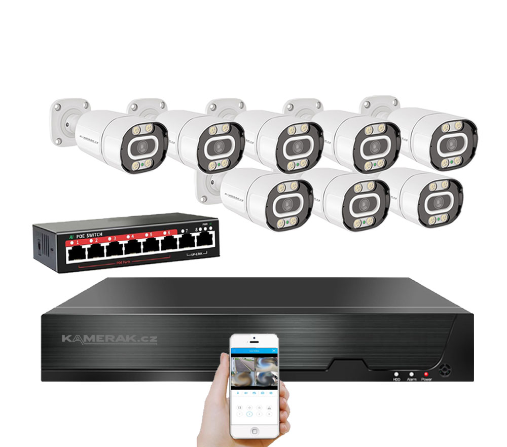 IP kamerový set s externím PoE pro jednoduché sestavení svépomocí. NVR v sobě nemá instalováno napájení kamer, které je řešeno pomocí switch. Lze tedy umístit switch (napájení IP kamer) na jiné místo než rekordér, který se následně připojuje k obrazovce/internetu.