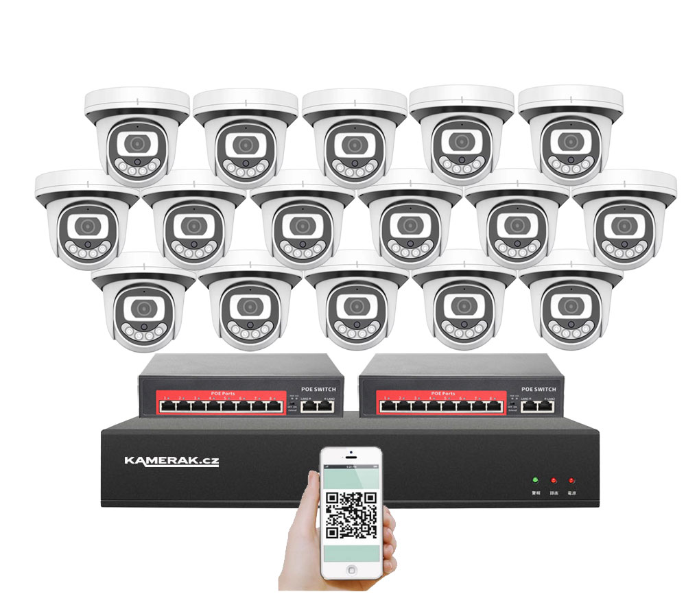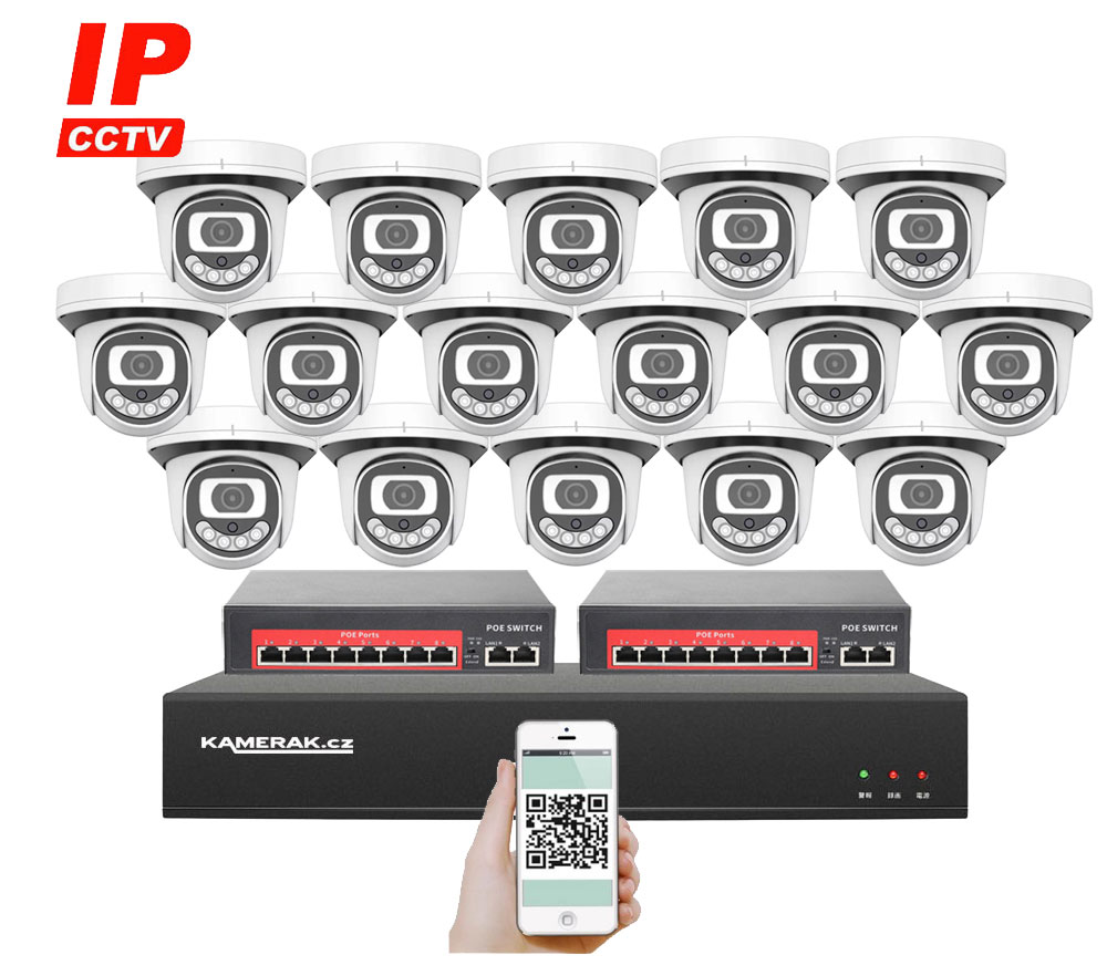 IP kamerový set s externím PoE pro jednoduché sestavení svépomocí. NVR v sobě nemá instalováno napájení kamer, které je řešeno pomocí switch. Lze tedy umístit switch (napájení IP kamer) na jiné místo než rekordér, který se následně připojuje k obrazovce/internetu.