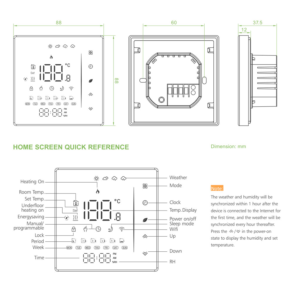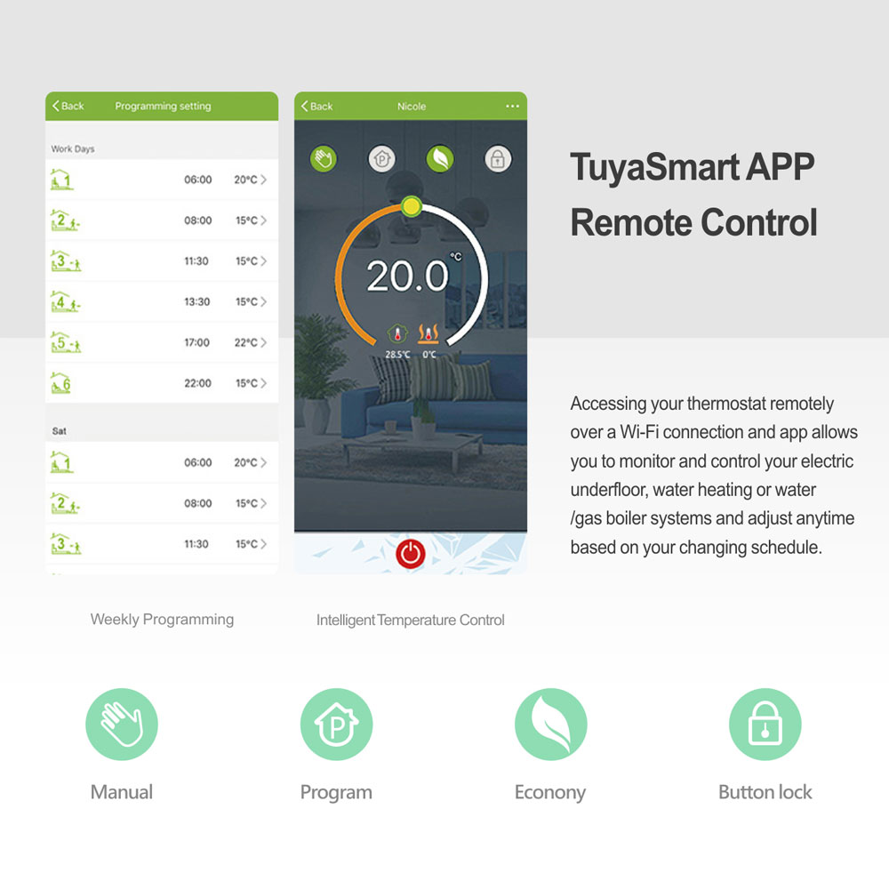 Díky chytré mobilní aplikaci TuyaSmart pro iOS a Android zařízení můžete u WiFi termostatu nastavit teplotu a další funkce i když jste na druhém konci světa. Budete neustále v obraze, získáte aktuální informace o stavu teploty, vlhkosti v domácnosti. Oceníte také jednoduchost a efektivitu aplikace. Zároveň díky ní můžete měnit libovolná nastavení a dozvědět se, kde má vaše domácnost rezervy a jak ještě lépe ušetřit. Termostat lze samozřejmě nastavit také ručně pomocí dotykových tlačítek.