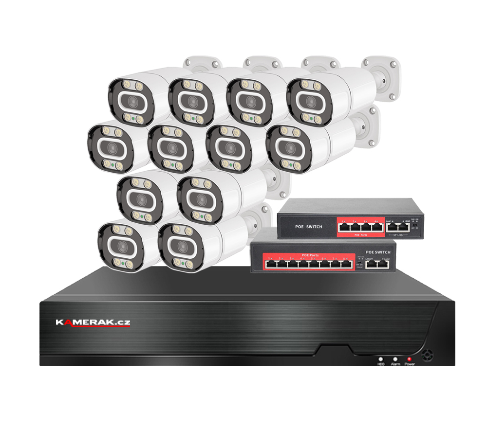 IP kamerový set s externím PoE pro jednoduché sestavení svépomocí. NVR v sobě nemá instalováno napájení kamer, které je řešeno pomocí switch. Lze tedy umístit switch (napájení IP kamer) na jiné místo než rekordér, který se následně připojuje k obrazovce/internetu.