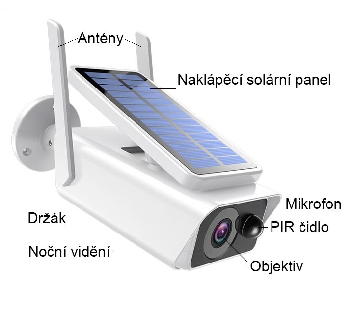 S podporou solárního dobíjení dvě nabíjecí baterie Li-ion typu 18650 dokáží kameru napájet po dobu až 3 měsíce (při 15 detekcích pohybu denně s 15s záznamem videa při každé detekci), poté stačí dobít baterie v nabíječce baterií ( není součástí prodeje). V případě vybití baterií lze nabít i adaptérem 5V min.1A. (pozor, nelze použít více, než 5V adaptér, aby nedošlo k poškození kamery)