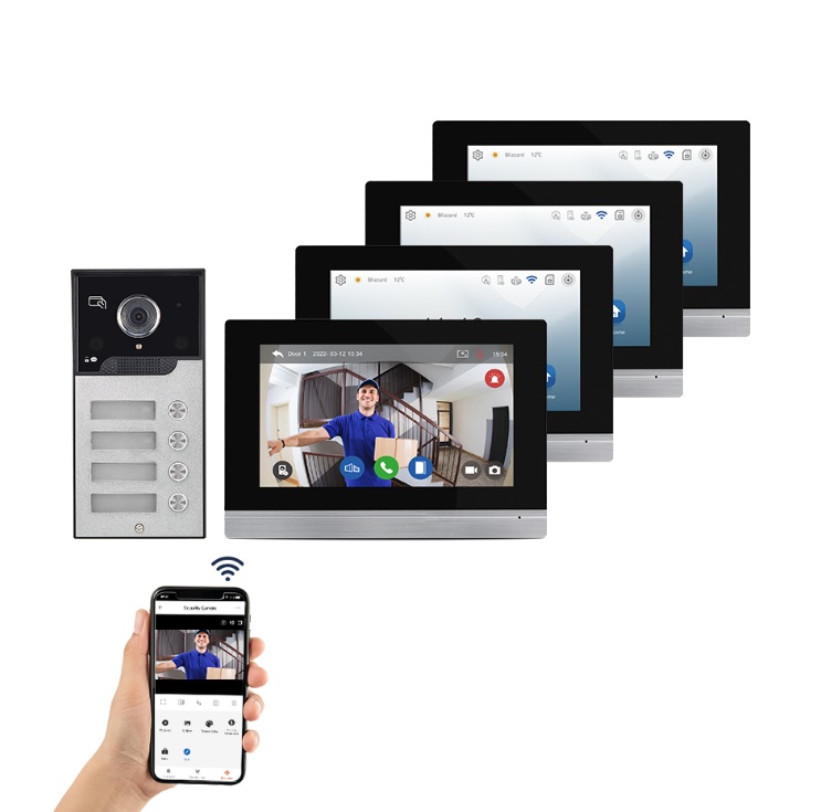 Sada 4ks Chytrého Wifi Video Telefonu a vnější Jednotky s integrovanou kamerou se dvěma zvonky s možností připojení dalších PoE IP kamer. Vnější jednotka vybavena RFID čtečkou umožňující autorizaci a tím i otevření el. zámku přiložením RFID čipu.