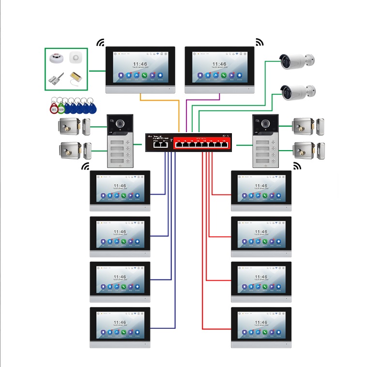 V případě využítí více zařízení se využívá PoE Switch (níže v doporučeném zboží), kdy PoE switch zapojíte do zásuvky 230V a následně všechny komponenty (další monitor, další video zvonek či kamery) připojíte do PoE switche (data i napájení jedním UTP kabelem). Pro vzdálenou správu pomocí mobilní aplikace připojíte monitor (vnitřní jednotky) pomocí WiFi nebo připojte PoE switch kabelově k routeru. (ve fotogalerii schéma zapojení)