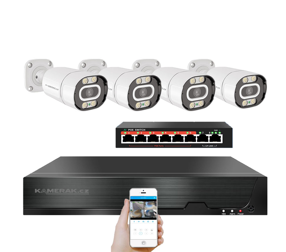 IP kamerový set s externím PoE pro jednoduché sestavení svépomocí. NVR v sobě nemá instalováno napájení kamer, které je řešeno pomocí switch. Lze tedy umístit switch (napájení IP kamer) na jiné místo než rekordér, který se následně připojuje k obrazovce/internetu.
