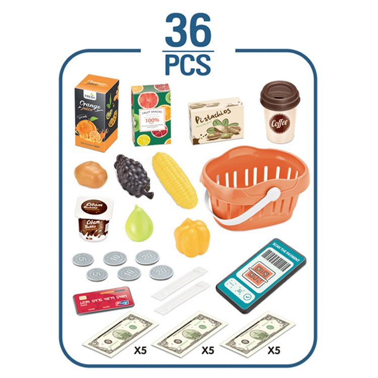 Obsah balení 36 ks (pokladna, skener, potraviny, peníze, košík aj.)
