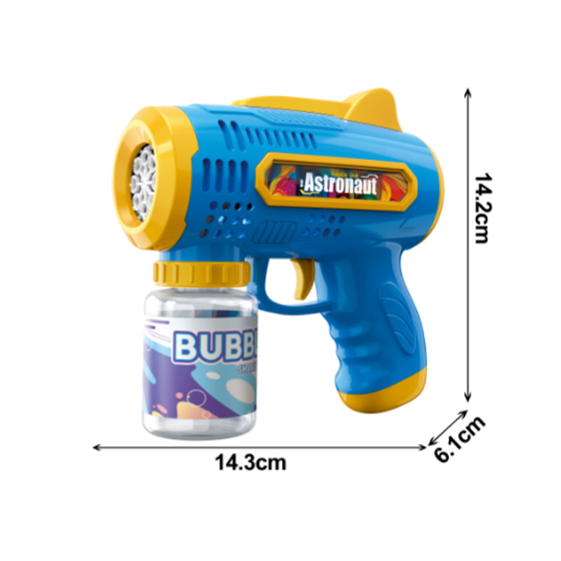Pistole je vyrobena z odolného plastu, bezpečná na používání a vhodná pro hraní venku i uvnitř. Součástí balení je 70ml bublinková kapalina, takže zábava může začít okamžitě. K provozu jsou potřeba 4× AA baterie (nejsou součástí balení).