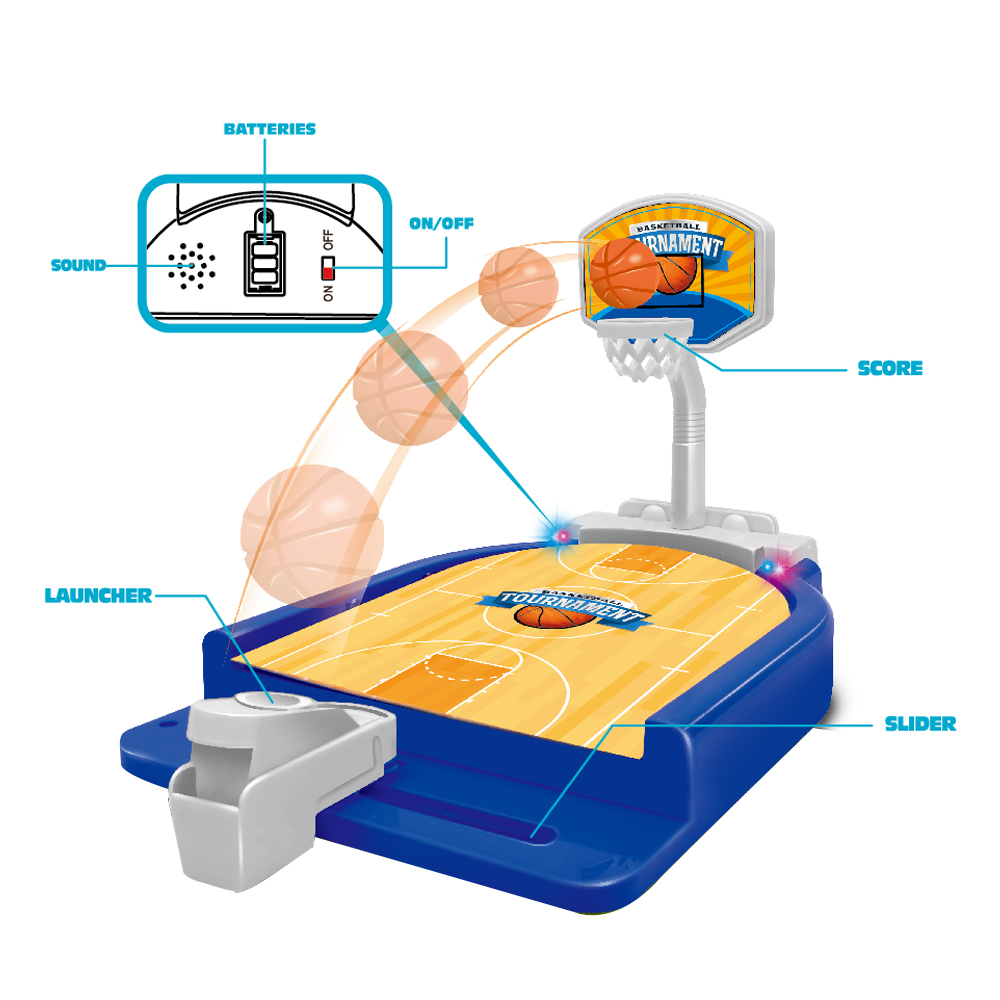 Mini stolní basketbalová hra je ideální volbou pro malé sportovní nadšence. Díky kompaktnímu designu se snadno vejde na stůl a děti si mohou užít napínavý zápas kdykoliv a kdekoliv. Hra je vybavena hudbou a světelnými efekty, které dodávají hře ještě větší zábavu a dynamiku. Stačí vystřelit míček pomocí odpalovací páčky a trefit se do koše!