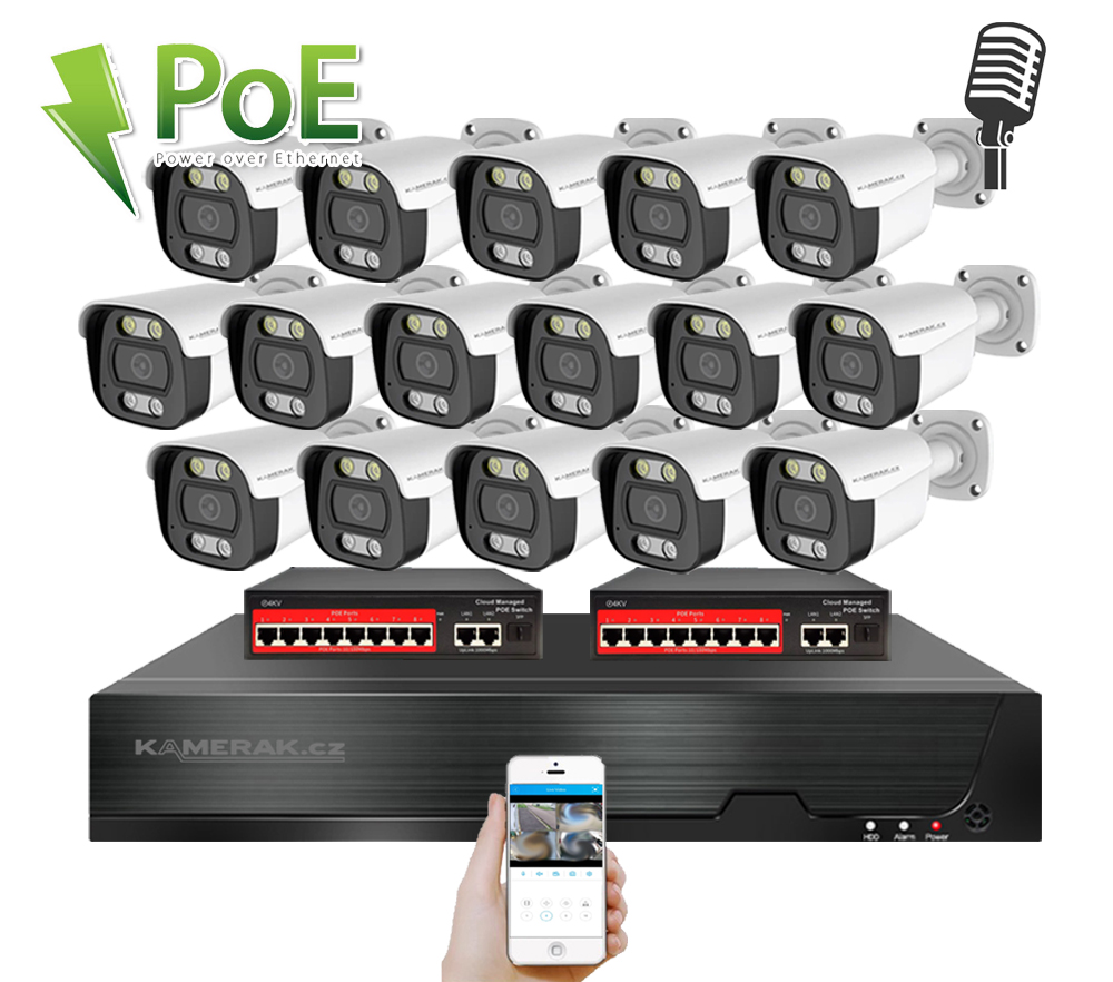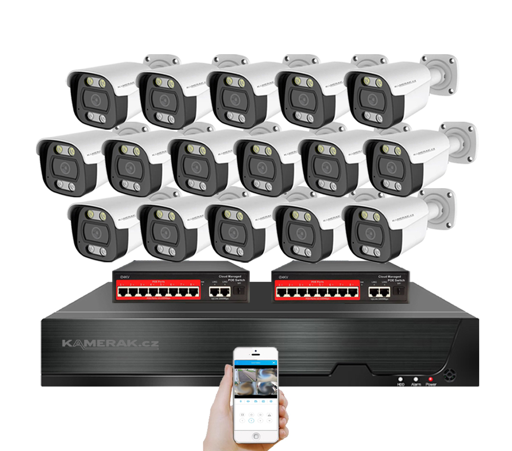 IP kamerový set s externím PoE pro jednoduché sestavení svépomocí. NVR v sobě nemá instalováno napájení kamer, které je řešeno pomocí switch. Lze tedy umístit switch (napájení IP kamer) na jiné místo než rekordér, který se následně připojuje k obrazovce/internetu.