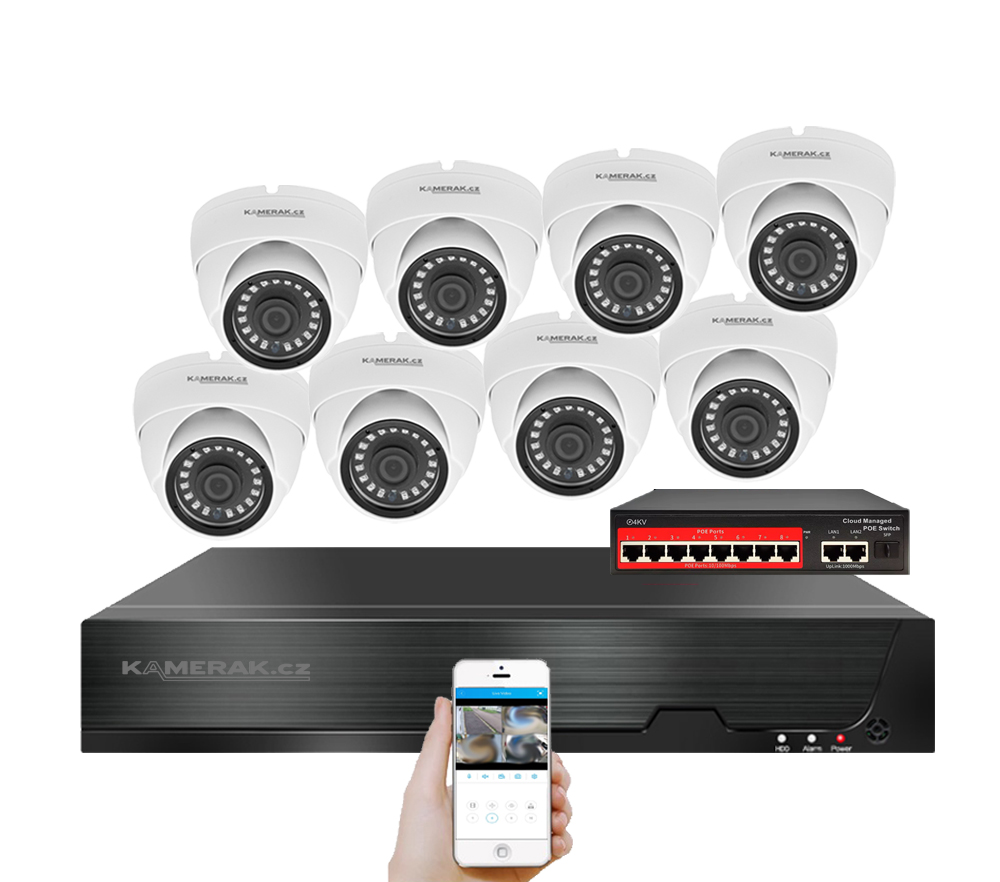 IP kamerový set s externím PoE pro jednoduché sestavení svépomocí. NVR v sobě nemá instalováno napájení kamer, které je řešeno pomocí switch. Lze tedy umístit switch (napájení IP kamer) na jiné místo než rekordér, který se následně připojuje k obrazovce/internetu.