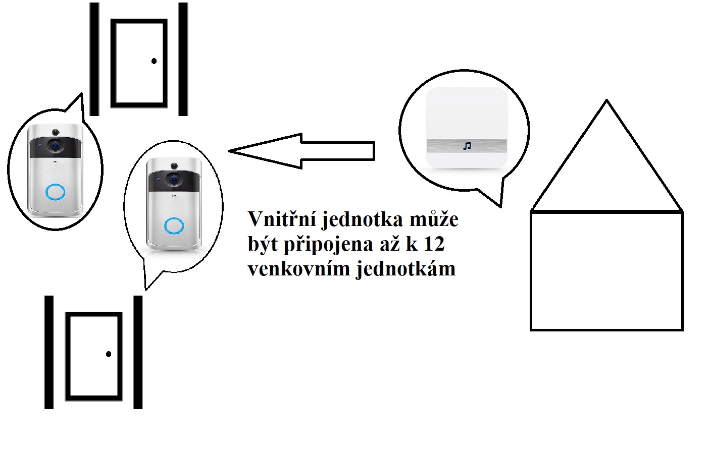 Díky funkci připojení více vnitřních jednotek lze z jednoho video zvonku vysílat signál a tím spustit zvonění na více vnitřních jednotkách a umožnít tak upozornění na zvonění u dveří ve více místnostech.