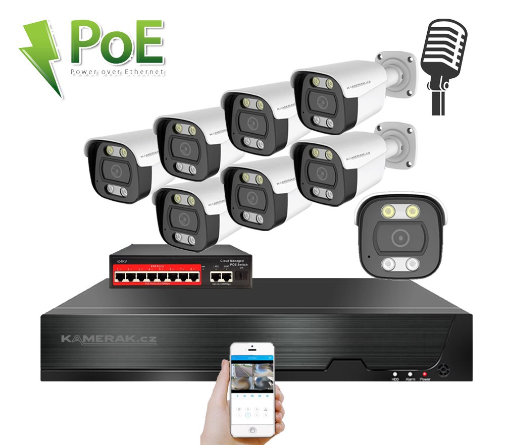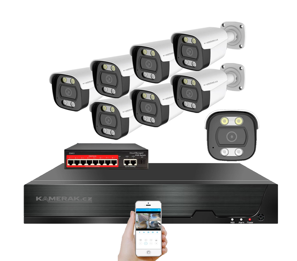 IP kamerový set s externím PoE pro jednoduché sestavení svépomocí. NVR v sobě nemá instalováno napájení kamer, které je řešeno pomocí switch. Lze tedy umístit switch (napájení IP kamer) na jiné místo než rekordér, který se následně připojuje k obrazovce/internetu.
