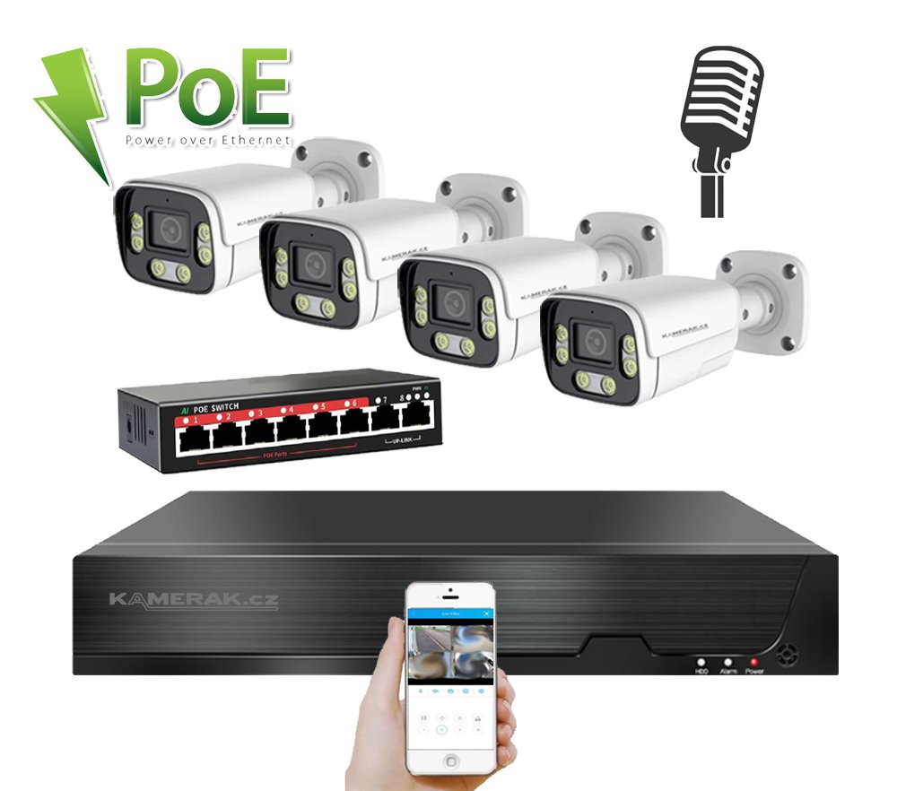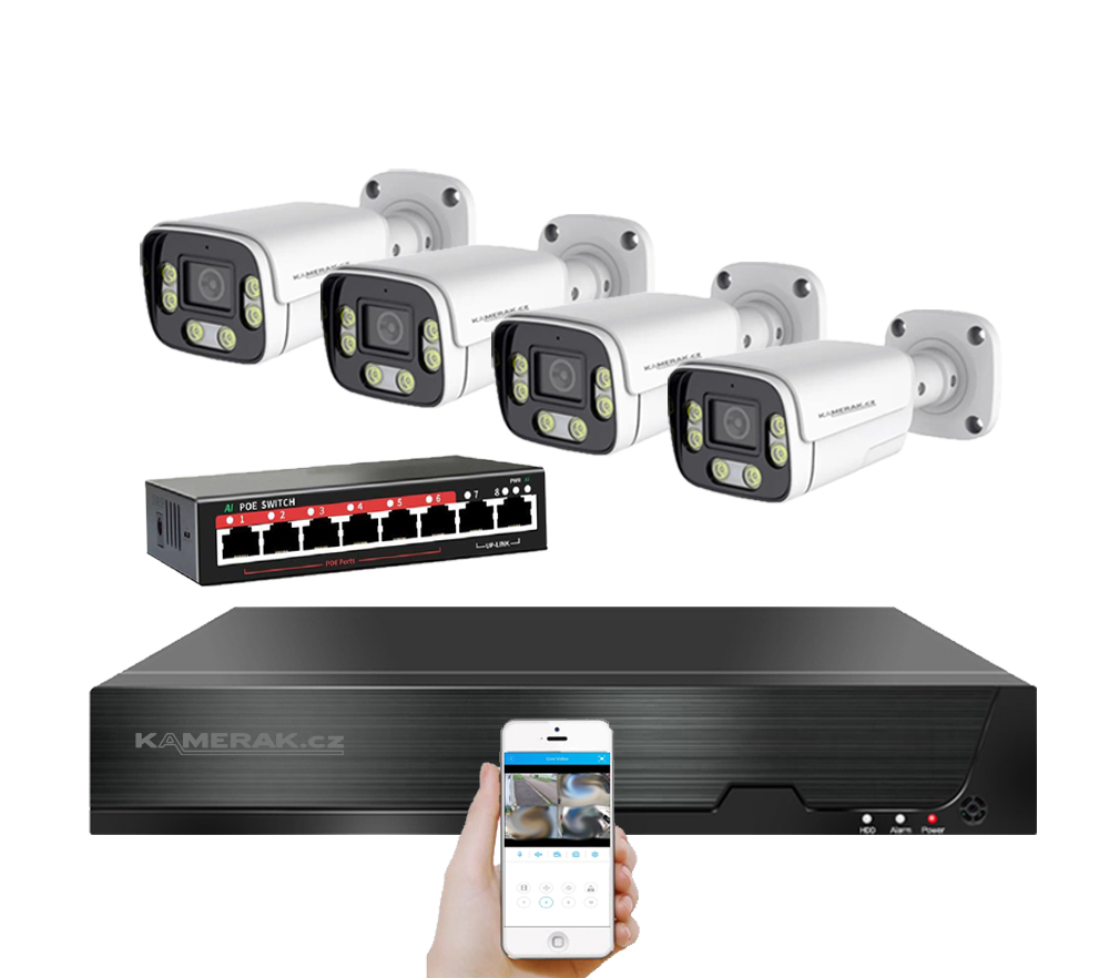 IP kamerový set s externím PoE pro jednoduché sestavení svépomocí. NVR v sobě nemá instalováno napájení kamer, které je řešeno pomocí switch. Lze tedy umístit switch (napájení IP kamer) na jiné místo než rekordér, který se následně připojuje k obrazovce/internetu.