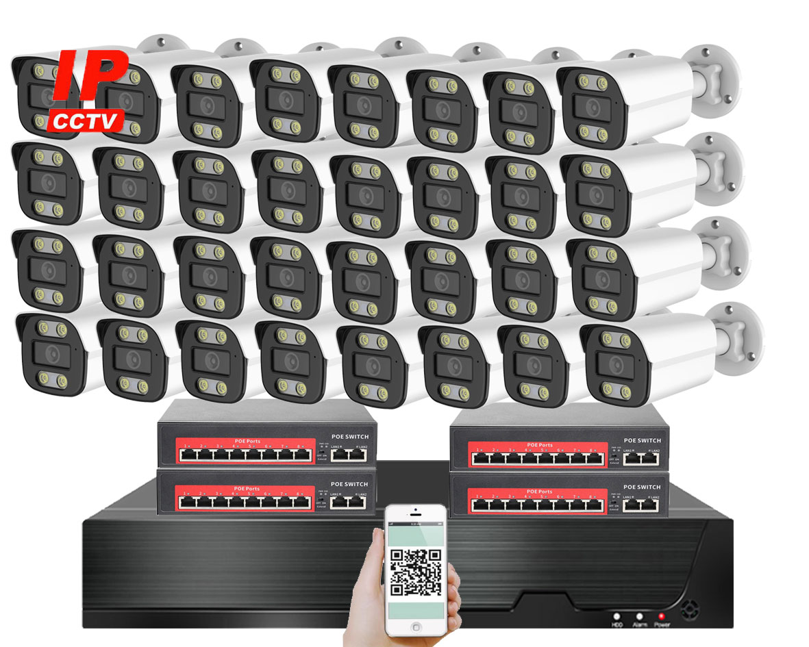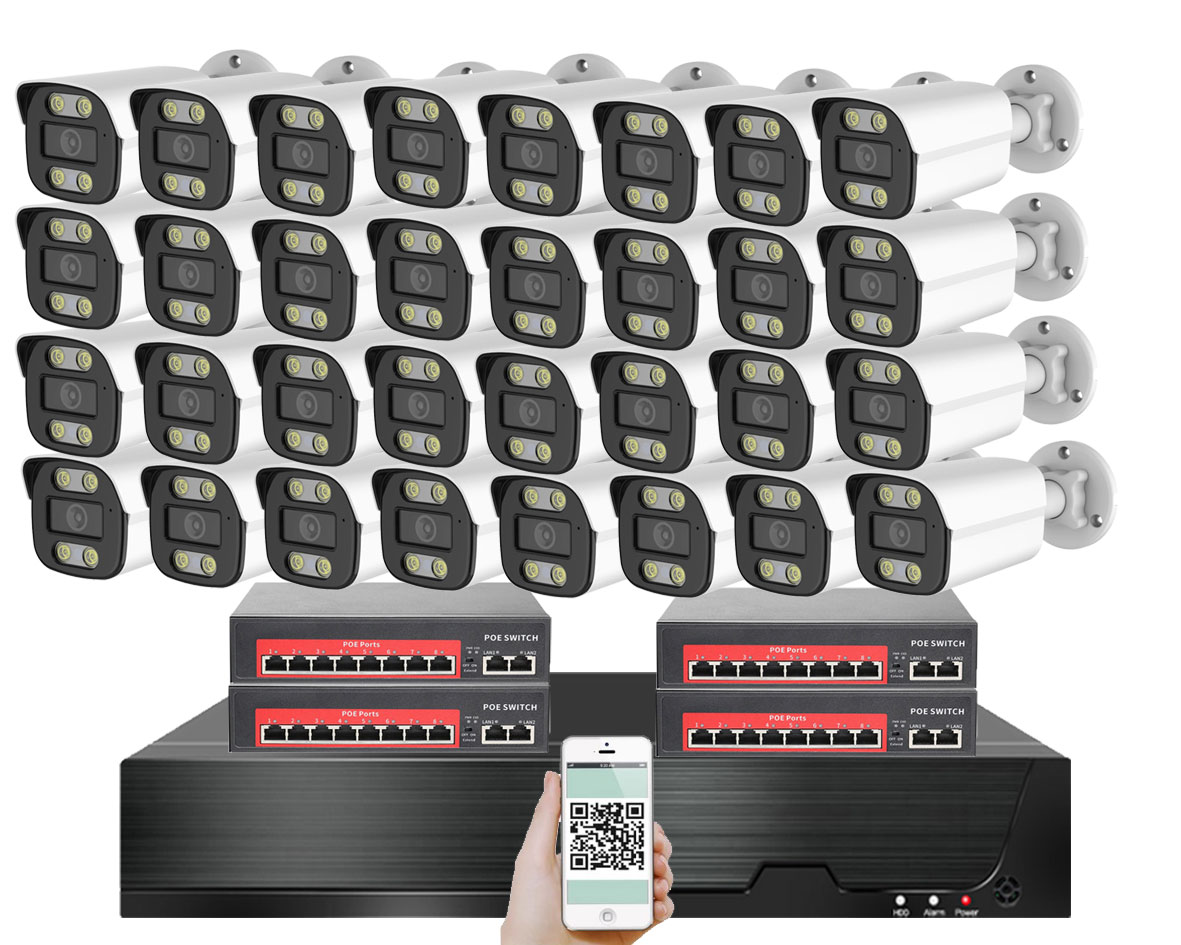 IP kamerový set s externím PoE pro jednoduché sestavení svépomocí. NVR v sobě nemá instalováno napájení kamer, které je řešeno pomocí switch. Lze tedy umístit switch (napájení IP kamer) na jiné místo než rekordér, který se následně připojuje k obrazovce/internetu.